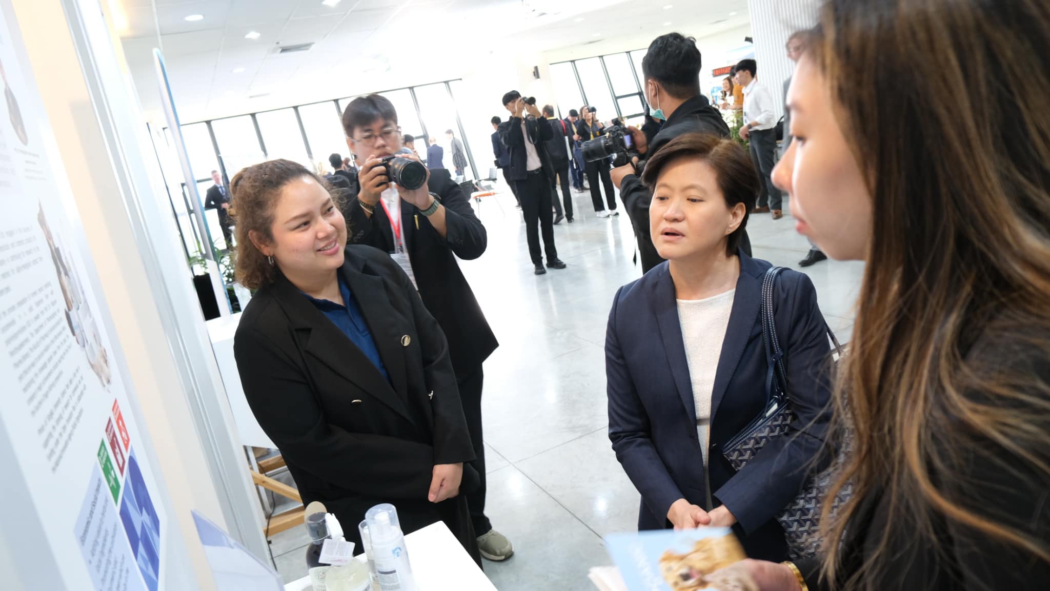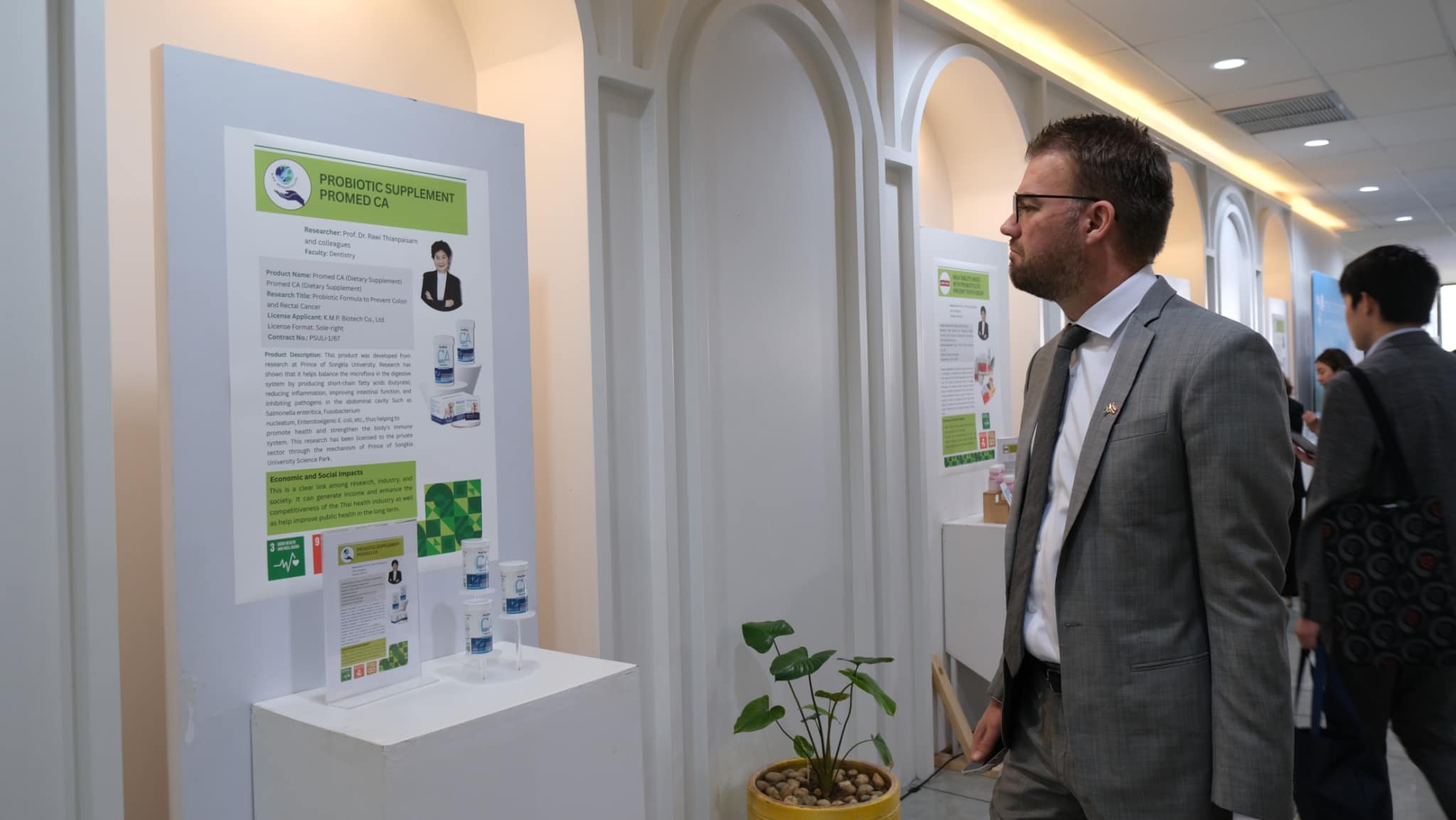 📌โดยภายในกิจกรรมได้มีการจัดแสดงผลงานวิจัยและนวัตกรรมมีภาคเอกชนนำไปใช้ประโยชน์เชิงพาณิชย์ของมหาวิทยาลัยสงขลานครินทร์ ที่มีศักยภาพด้านต่างๆ อาทิ ซุปเปอร์แบคทีเรียสำหรับการผลิตปุ๋ยอินทรีย์ หมอนเจลจากยางพารา ถุงทวารเทียม แว่นสำหรับผู้พิการทางสายตาฝึกทักษะการรับรู้เสียงสะท้อน ผลิตภัณฑ์แชมพูทำความสะอาดสัตว์เลี้ยงแบบแห้ง น้ำลายเทียมแบบเจลบอล อุปกรณ์ช่วยผ่าตัดโรคพังผืดกดรัดเส้นประสาทข้อมือและทิศทาง การพัฒนาเส้นหมี่เพื่อสุขภาพที่ลดค่าพลังงานใยอาหารสูงและส่งเสริมสุขภาพทางเดินอาหาร กรรมวิธีการลดโลหะหนักในอาหารทะเล ฟิล์มสเปรย์พ่นบนผิวฟัน ผลิตภัณฑ์โพรไบโอติก