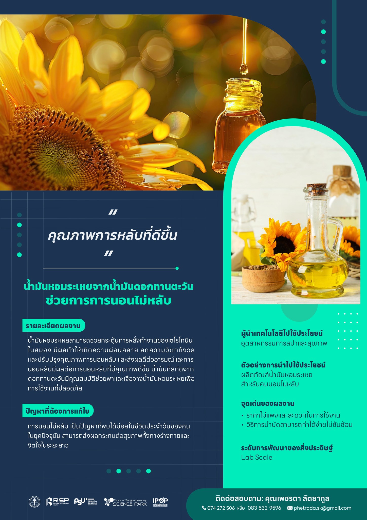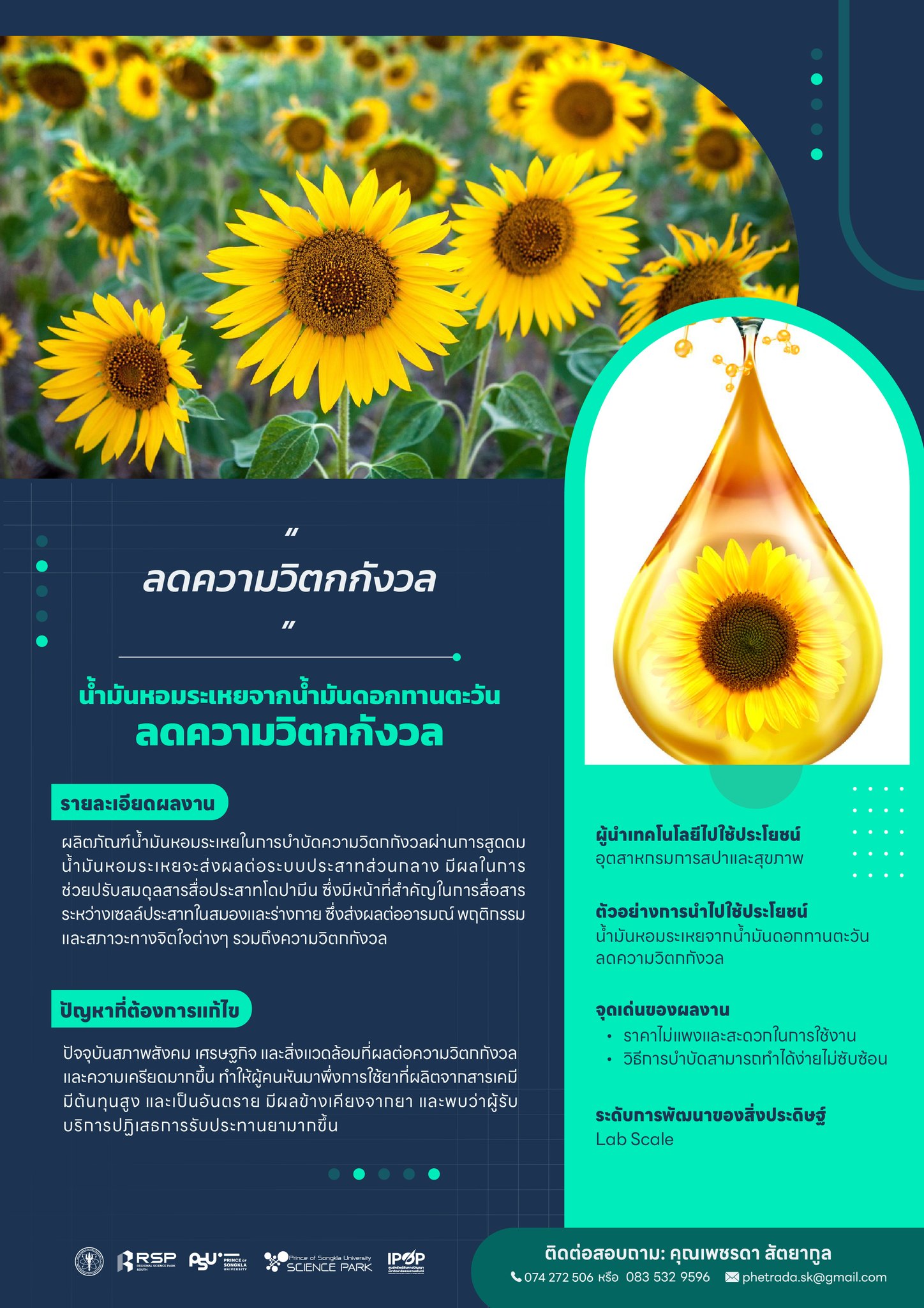 อุทยานวิทยาศาสตร์ มหาวิทยาลัยสงขลานครินทร์ มีการดำเนินงานที่มุ่งเน้นกลุ่มอุตสาหกรรมยางพารา และปาล์มน้ำมันที่มีเป้าหมายสอดคล้อง กับยุทธศาสตร์การพัฒนาอุทยานวิทยาศาสตร์ของประเทศ (พ.ศ. 2556 – พ.ศ.2560) โดยมุ่งเน้นส่งเสริมให้ภาคเอกชนลงทุนทำวิจัยและพัฒนา นำทรัพยากรและโครงสร้าง พื้นฐานวิจัยและพัฒนาในภาครัฐมาใช้ให้เกิดประโยชน์ เชื่อมโยงอุทยานวิทยาศาสตร์กับการพัฒนา เศรษฐกิจของพื้นที่สนับสนุนให้เกิดผู้ประกอบการฐานธุรกิจเทคโนโลยีอย่างยั้งยืน รวมถึงพัฒนาศักยภาพของอุทยานวิทยาศาสตร์ภูมิภาค อันเป็นการเตรียมความพร้อมเพื่อรองรับการเติบโตทางเศรษฐกิจในอนาคต รายละเอียด