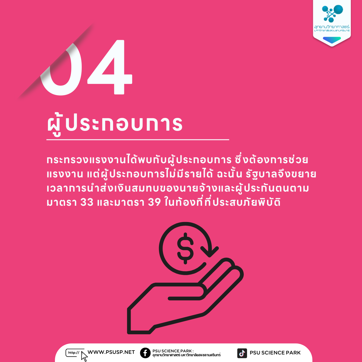 📌4) ผู้ประกอบการ: กระทรวงแรงงานได้พบกับผู้ประกอบการ ซึ่งต้องการช่วยแรงงาน แต่ผู้ประกอบการไม่มีรายได้ ฉะนั้น รัฐบาลจึงขยายเวลาการนำส่งเงินสมทบของนายจ้างและผู้ประกันตนตามมาตรา 33 และมาตรา 39 ในท้องที่ที่ประสบภัยพิบัติ