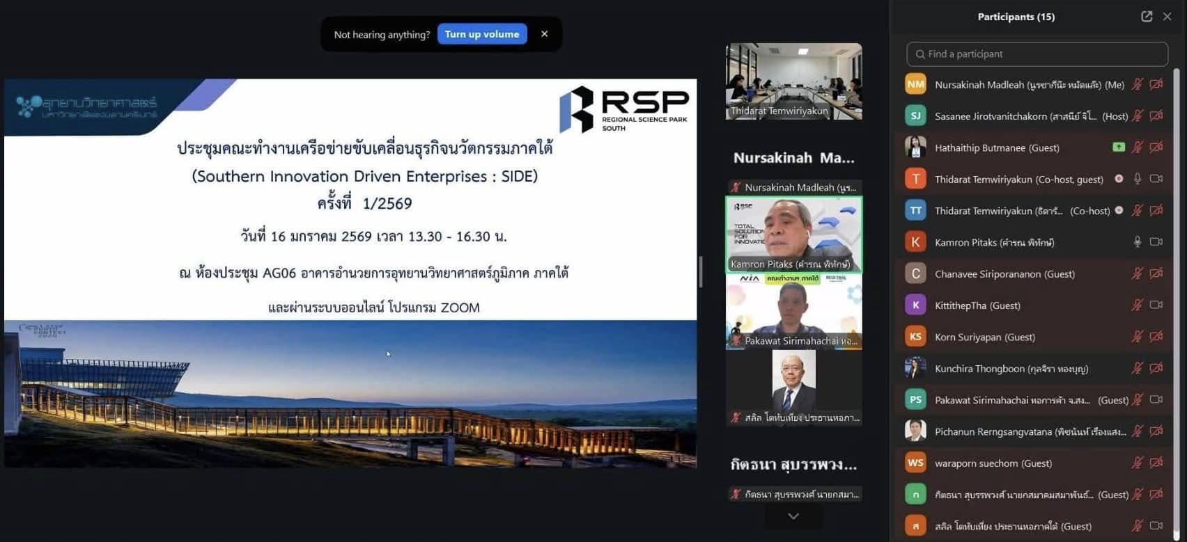 📌วันที่ 16 มกราคม 2569 อุทยานวิทยาศาสตร์ภูมิภาค ภาคใต้ จัดการประชุมคณะทำงานเครือข่ายขับเคลื่อนธุรกิจนวัตกรรมภาคใต้ (Southern Innovation Driven Enterprises : SIDE) ครั้งที่ 1/2569 ณ ห้องประชุม AG06 อาคารอำนวยการอุทยานวิทยาศาสตร์ภูมิภาค ภาคใต้ และผ่านระบบออนไลน์ Zoom โดยมีหน่วยงานภาครัฐ ภาคเอกชน และเครือข่ายผู้ประกอบการเข้าร่วมอย่างพร้อมเพรียง