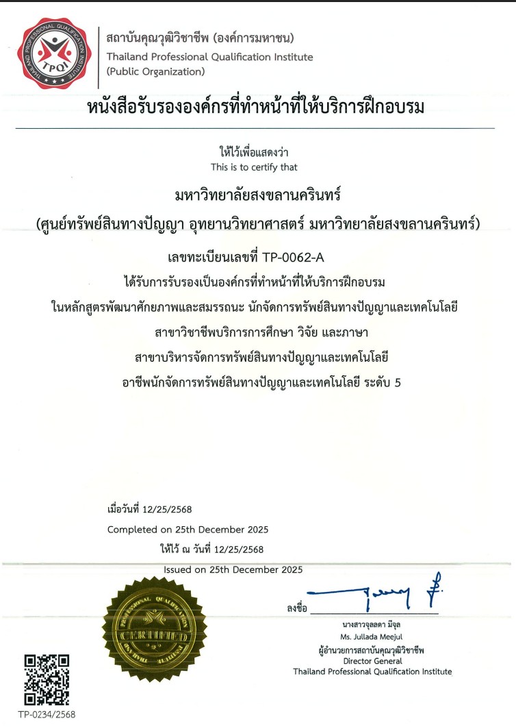 มีความยินดีอย่างยิ่งที่จะประกาศความสำเร็จครั้งสำคัญ ในการได้รับการรับรองอย่างเป็นทางการให้เป็น Training Provider ในหลักสูตรพัฒนาศักยภาพและสมรรถนะ “นักจัดการทรัพย์สินทางปัญญาและเทคโนโลยี ระดับ 5”