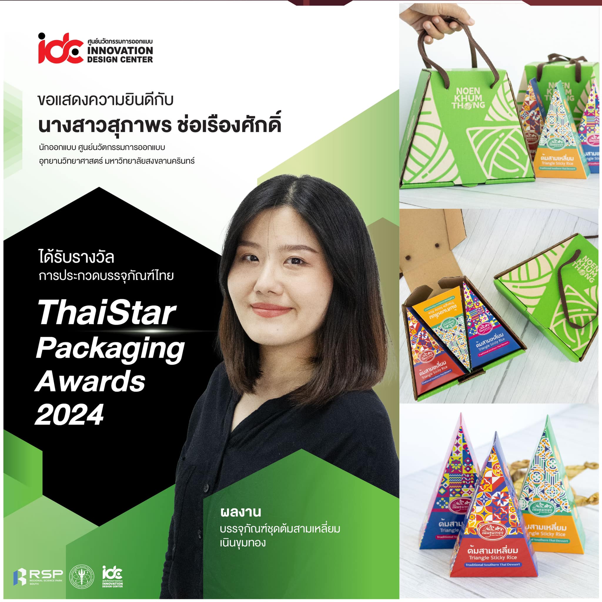 ขอแสดงความยินดีกับนักออกแบบ จากศูนย์นวัตกรรมการออกแบบ อุทยานวิทยาศาสตร์ มหาวิทยาลัยสงขลานครินทร์ คว้า 3 รางวัล ในการประกวดบรรจุภัณฑ์ไทย ประจำปี 2567 - ThaiStar Packaging Awards 2024 ในประเภทบรรจุภัณฑ์เพื่อการจัดจำหน่าย สำหรับสินค้าทั่วไป โดยนางสาวสุภาพร ช่อเรืองศักดิ์ ได้รับ 2 รางวัลจากผลงานบรรจุภัณฑ์ยาดมสมุนไพรแม่เศรษฐี และบรรจุภัณฑ์ชุดต้มสามเหลี่ยมเนินขุมทอง นางสาวต่วนสาปีหนะ รายอเงาะ ได้รับ 1 รางวัล จากผลงานบรรจุภัณฑ์ชุดข้าวบัสมาติพร้อมหุง